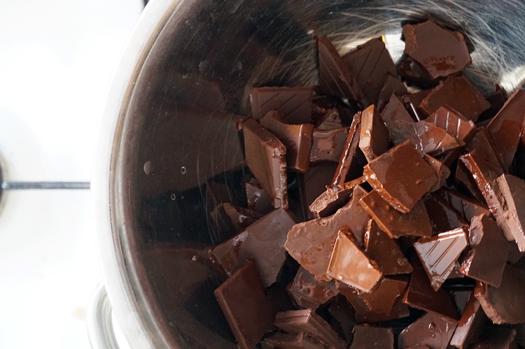 A csokit daraboljuk fel, majd a kókuszolajjal együtt, forró víz felett olvasszuk fel. Amikor a csoki teljesen felolvadt, rakjuk félre hűlni.